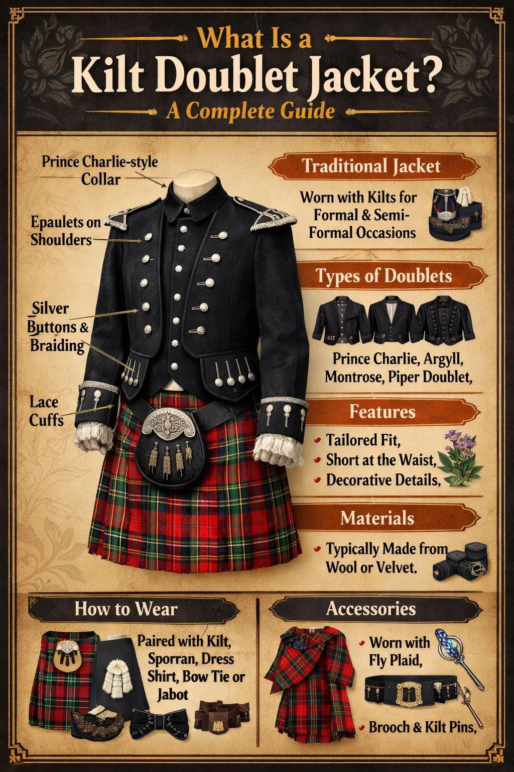 For formal events, choose an Argyll or Prince Charlie jacket. For casual wear, a tweed jacket or no jacket works well, especially with a hunting sporran. -